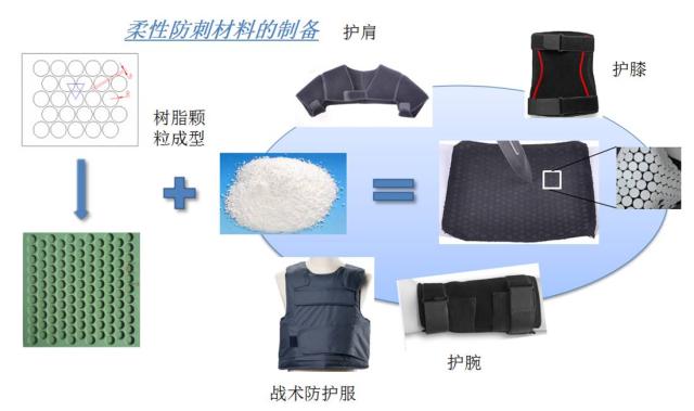 通过高分子树脂成型工艺,在基布织物表面形成坚固的防护层,经多层叠加能有效阻挡刀具,匕首等冷兵器的刺、割、砍的攻击。该材料柔软性能优良,能多方向折叠,透气性能优良,与相同防护等级现有防刺服相比,重量轻,厚度薄,可大大减少人体负荷。达到GA 68-2008 警用防刺服标准要求,已获国家发明专利授权。